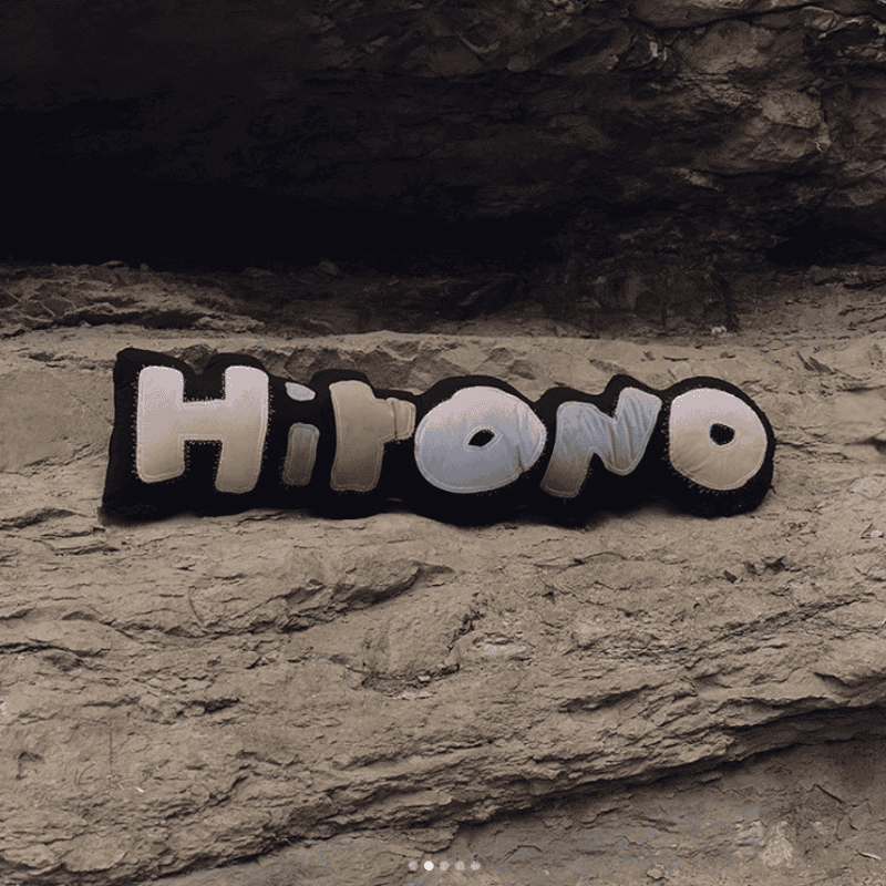 - Design – Features embroidered “Hirono” lettering in multi-colored fabric pieces, stitched onto a bold textile base.