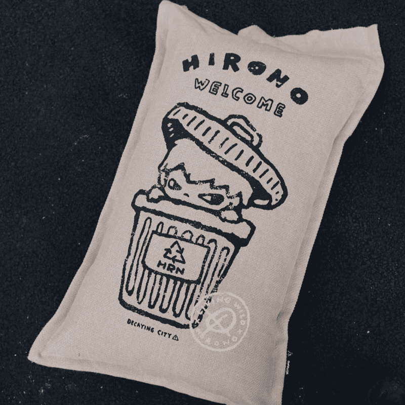 - Design – Features Hirono peeking out of a garbage bin with “HIRONO WELCOME” and “DECAYING CITY” text, plus stamp-style graphics referencing “Decaying Tokyo.”