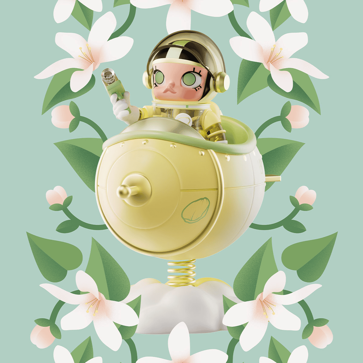 The figure features Molly in her signature space helmet, now adorned with jasmine motifs and delicate white accents. Her outfit blends futuristic styling with petal‑like sculpting, creating a harmonious balance between Molly’s playful character and the gentle charm of jasmine blossoms. The soft palette of whites and greens enhances the figure’s serene aura, while sculpted floral embellishments highlight the artistry behind the design.