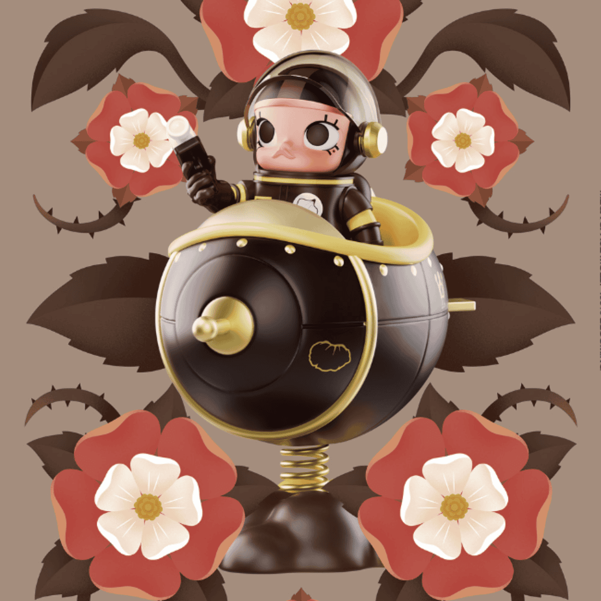 The figure features Molly in her signature space helmet, now adorned with Tudor rose motifs and elegant red‑and‑white accents. Her outfit blends futuristic styling with petal‑like sculpting, creating a harmonious balance between Molly’s playful character and the dignified charm of the rose. The palette of reds, whites, and greens enhances the figure’s stately aura, while sculpted floral embellishments highlight the artistry behind the design.