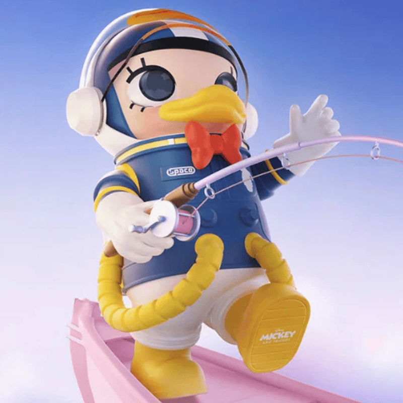 The Mega Space Molly 400% Donald Duck edition reimagines Donald’s classic sailor outfit, blue tones, and iconic cap through the structured Space Molly silhouette. His playful yet fiery personality shines in this crossover design, blending Pop Mart’s cosmic art toy aesthetic with Disney’s timeless character appeal.