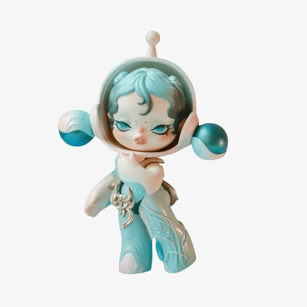 This edition features a large head framed by flowing blue curls, expressive eyes with delicate makeup, and a gentle mouth that conveys calmness. A helmet with rounded ear-like extensions and a central antenna adds a futuristic, space-inspired touch, while the body is adorned with a form-fitting suit in shades of blue and white. Swirling patterns and a metallic chest detail enhance the figure’s elegance, symbolizing fluidity and balance.