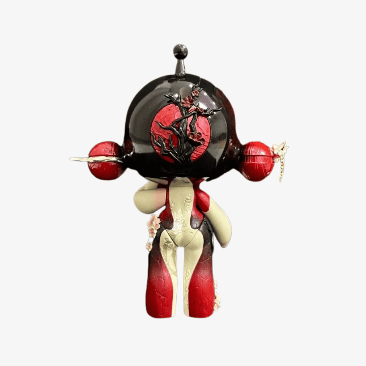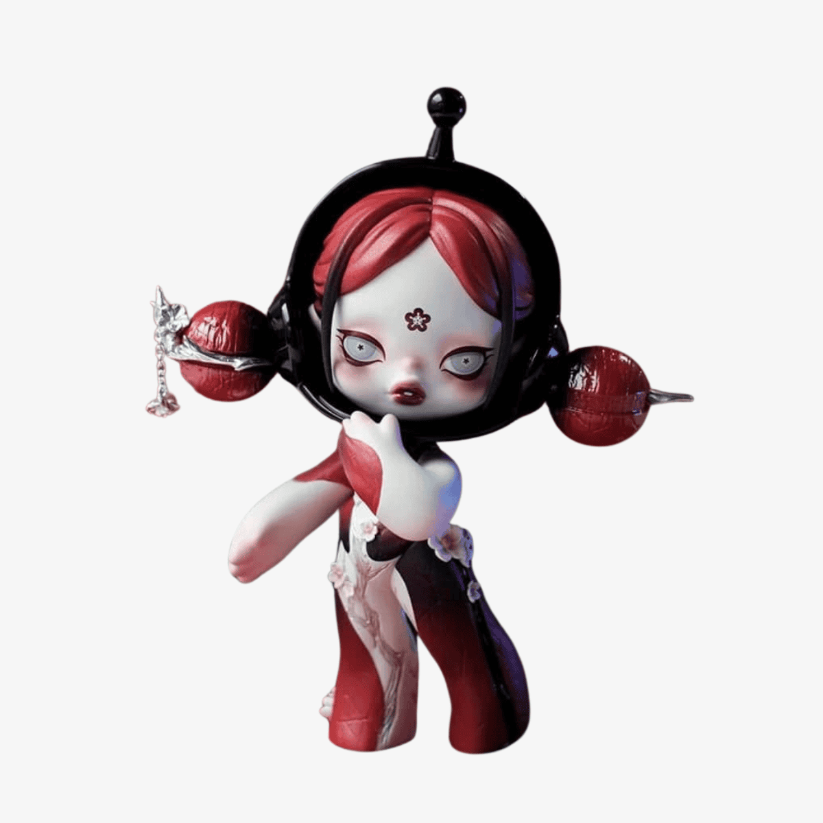 The figure features pale skin with striking red hair styled into two large buns, accented by metallic accessories that add a mechanical edge. A black helmet-like headpiece with a central antenna crowns the design, while a delicate flower symbol rests on the forehead, enhancing its ethereal aura. Large light-blue eyes convey innocence and depth, contrasting beautifully with the bold red-and-white outfit. Sculpted floral patterns and asymmetrical details across the attire highlight Skullpanda’s artistry, blending organic motifs with sci-fi elements.